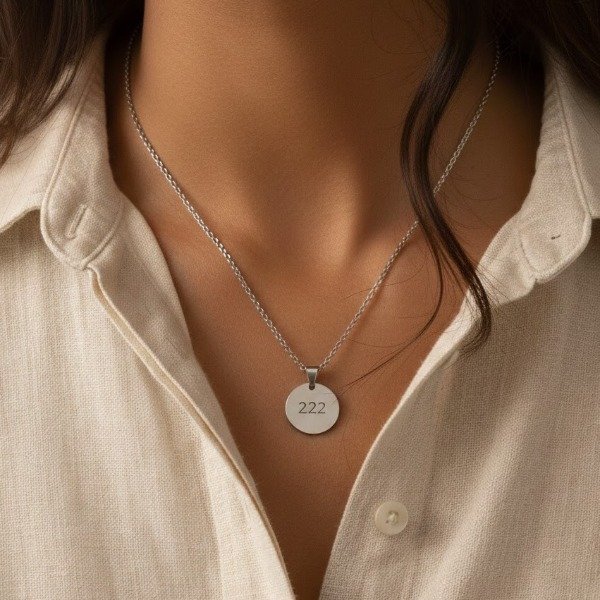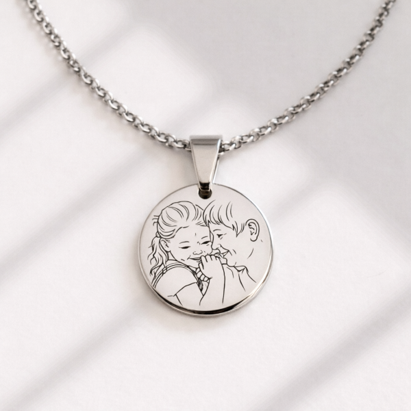Dije y cadena de acero quirúrgico con grabado personalizado de un lado.